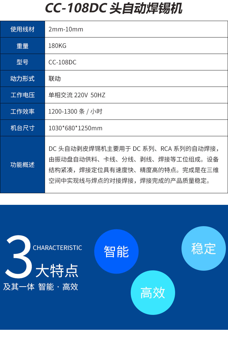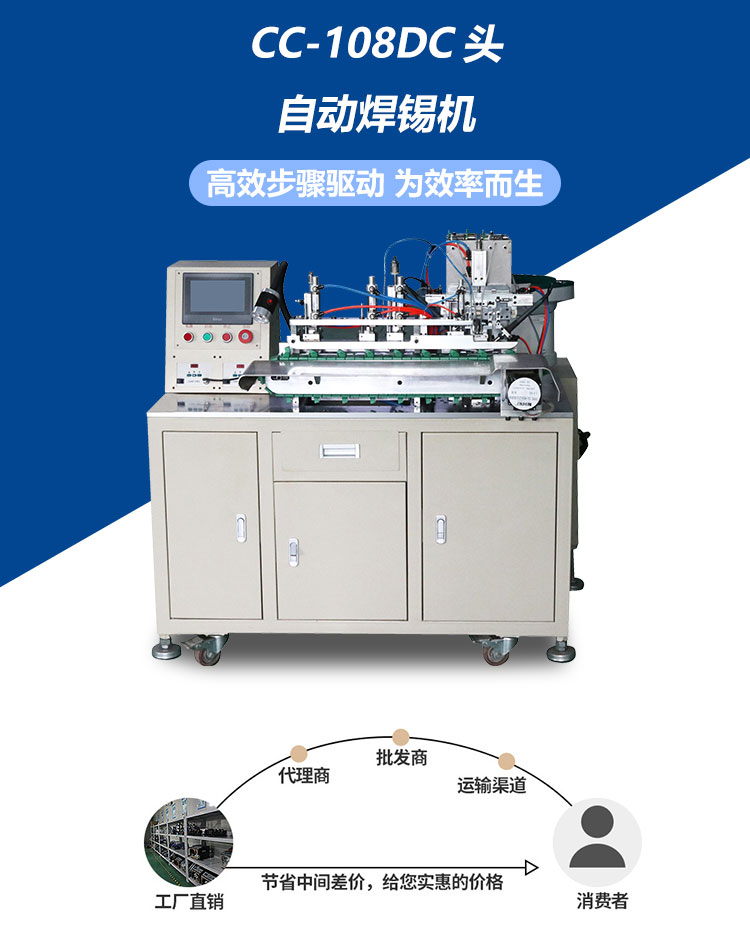DC頭自動剝皮焊錫機主要用于DC系列、RCA系列的自動焊接,由振動盤自動供料、卡線、分線、剝線、焊接等工位組成。設備結構緊湊,焊接定位具有速度快、精度高的特點。完成是在三維空間中實現線與焊點的對接焊接,焊接完成的產品質量穩定。