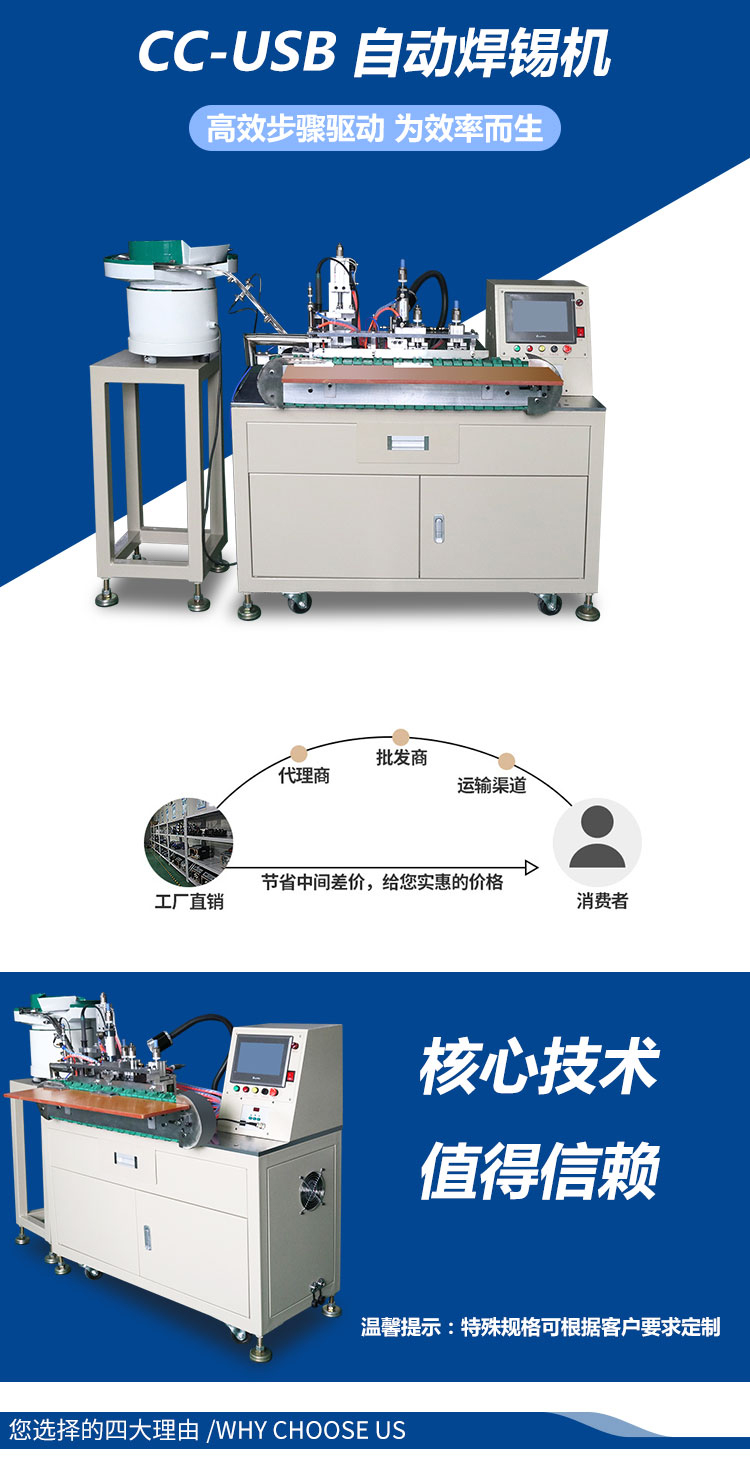 USB自動焊錫機,主要用于USB線纜長體A公、短體AM、MINI5PIN、MICRO5PIN的焊接,由振動盤自動供料、再分線、拉線、切平、剝皮、