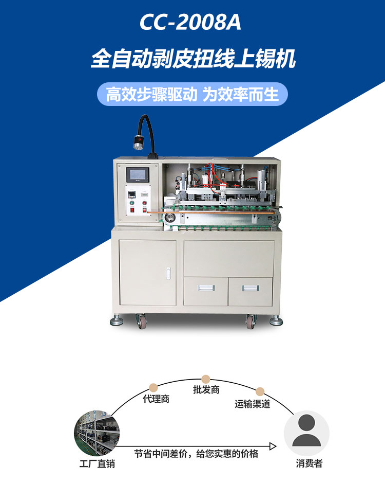 產品介紹:集分線、剝線、扭線、鍍錫、切平、一次完成,品質穩定,操作簡單,效率高,較之原始工作方式節省4個工位,提高效率。