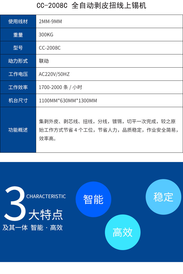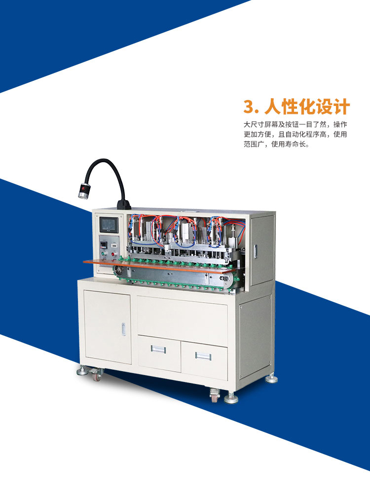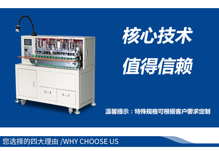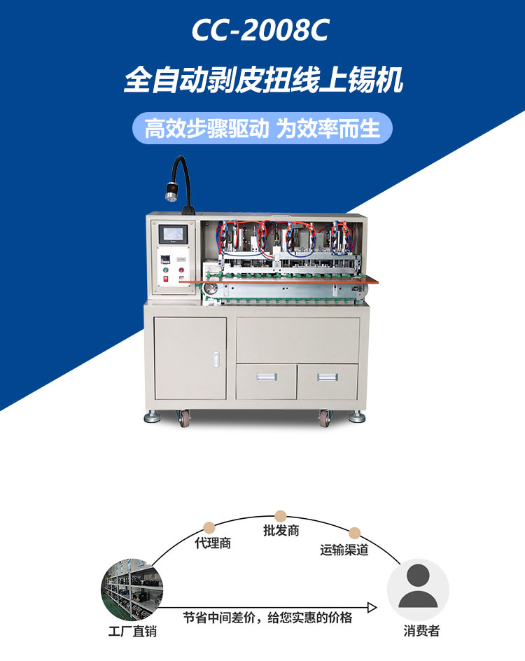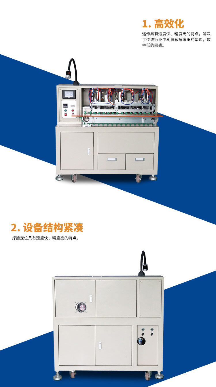 產(chǎn)品介紹:集分線、剝線、扭線、鍍錫、切平、一次完成,品質(zhì)穩(wěn)定,操作簡單,效率高,較之原始工作方式節(jié)省4個工位,提高效率。