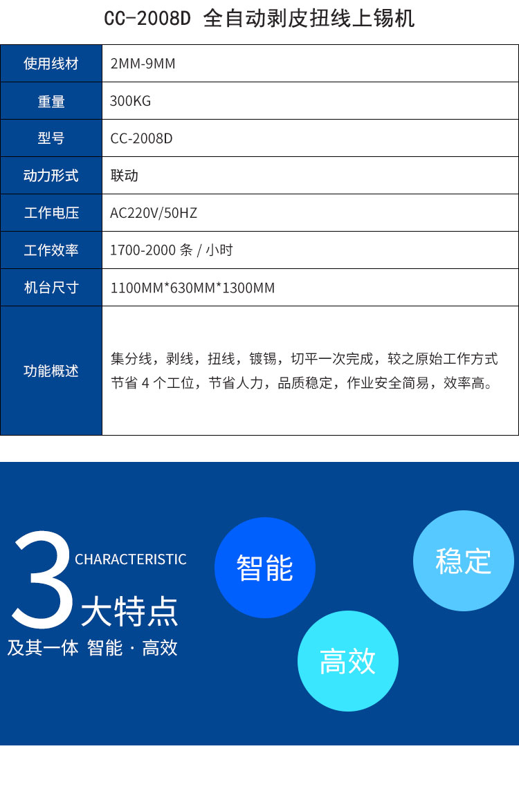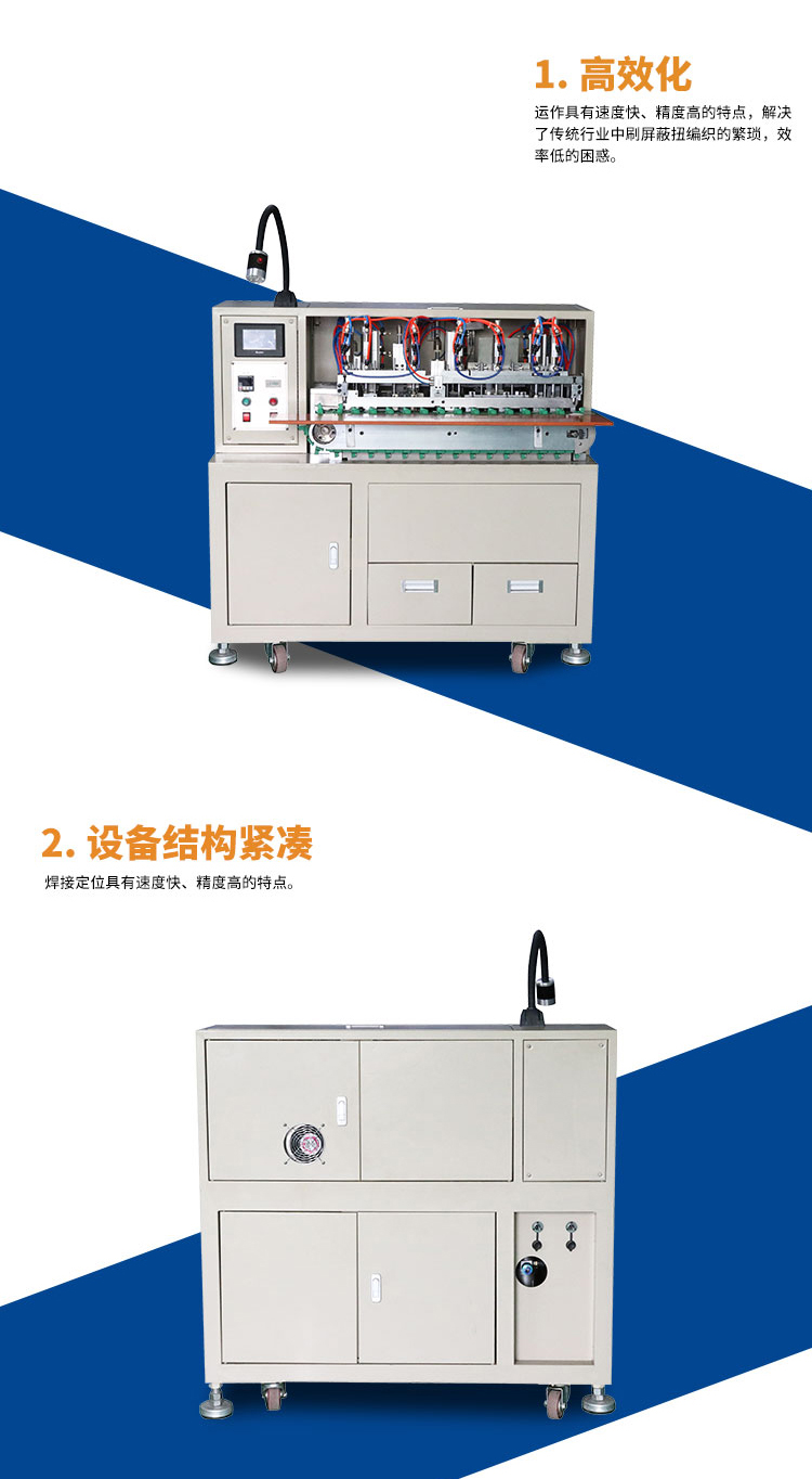 產品介紹:集分線、剝線、扭線、鍍錫、切平、一次完成,品質穩定,操作簡單,效率高,較之原始工作方式節省4個工位,提高效率。